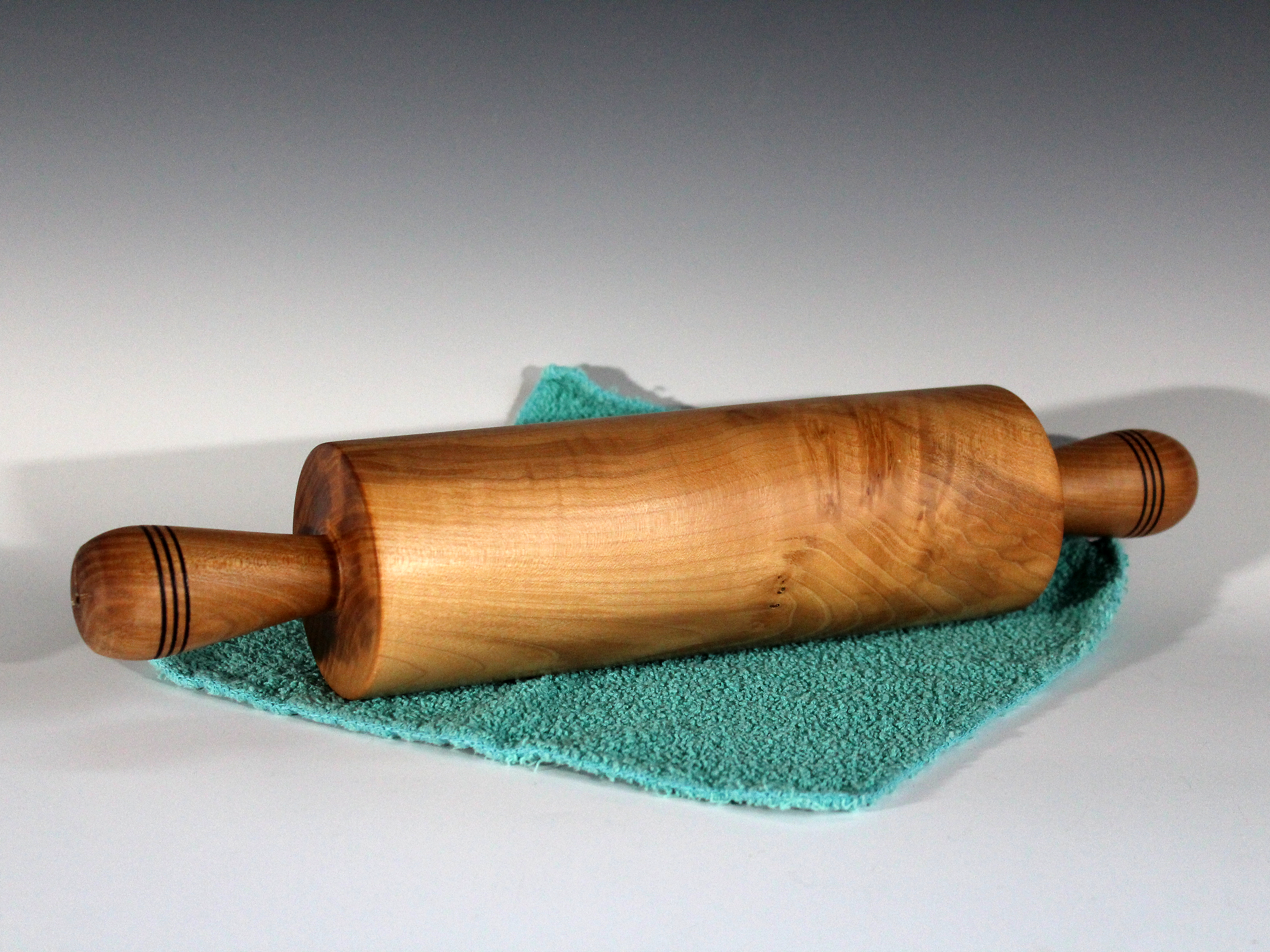 Rolling pin made from maple blank originally intended for a faux pirate ship baluster, from YUGE storm-felled maple tree from Dryad Rest; 15-1/4″ long x 3″ dia. Finished with regular canning wax (paraffin) rubbed on and then buffed at high speed so the wax melted and soaked into the wood.