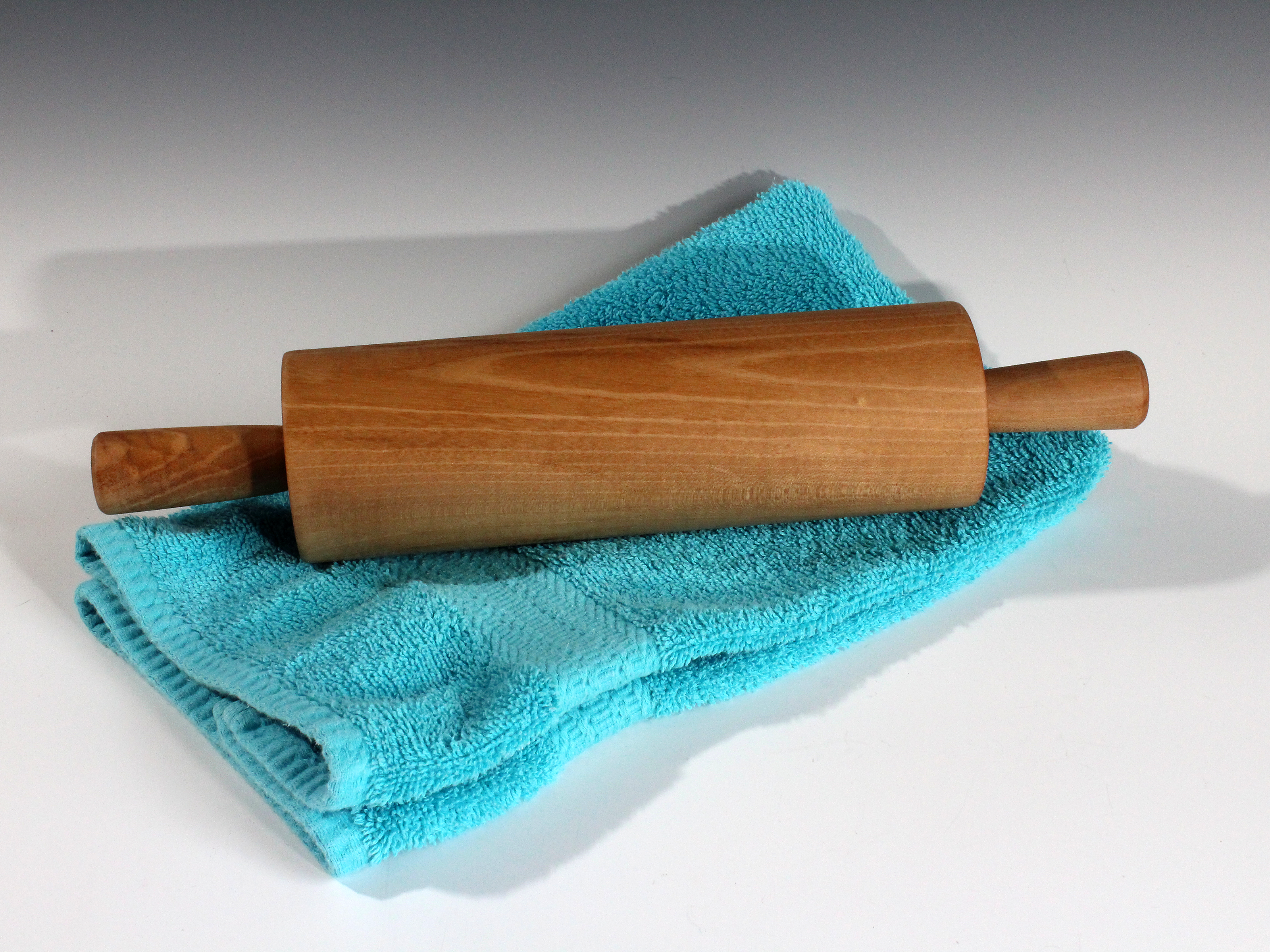 FOR SALE: Maple Rolling Pin; from maple blank originally intended for a faux pirate ship baluster, from YUGE storm-felled maple tree from Joanne Dryad Rest Kirley’s place. 13-7/8″ long x 2-3/4″” dia. Finished with regular canning wax (paraffin) rubbed on and then buffed at high speed so the wax melted and soaked into the wood. $55 (USD) [M032]
