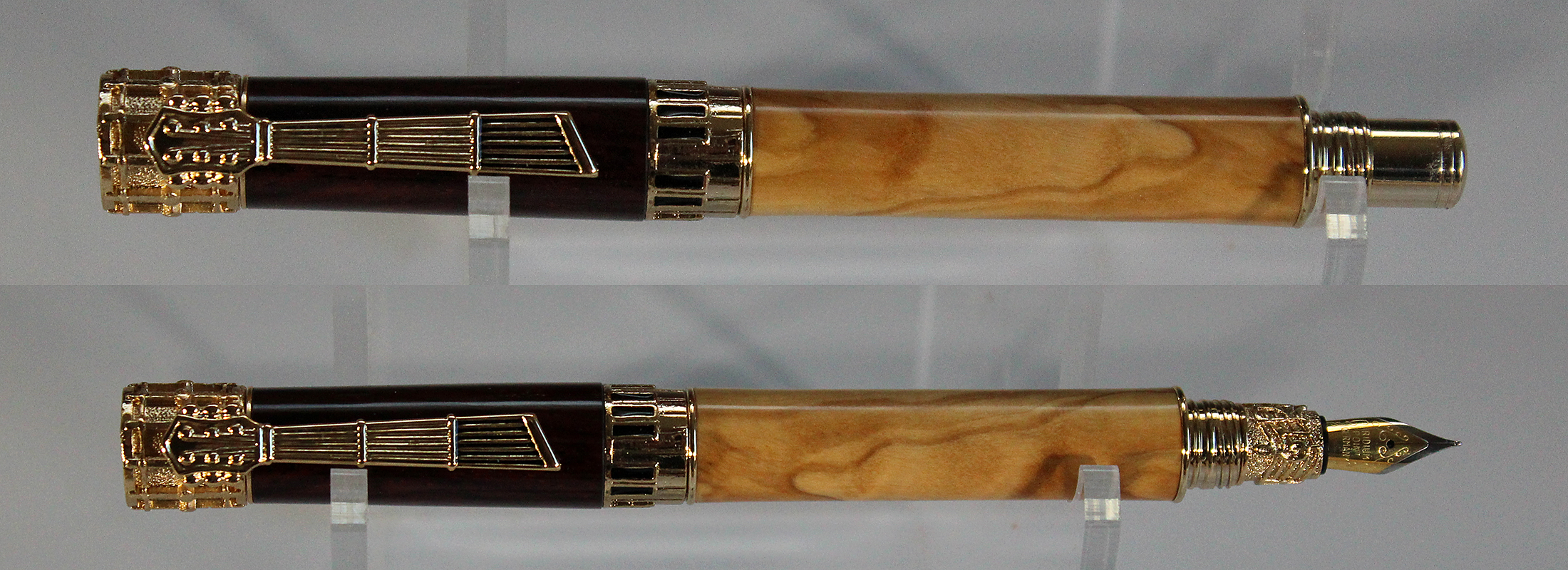Music fountain pen; 24K gold; cap is cocobolo, barrel is olive wood.