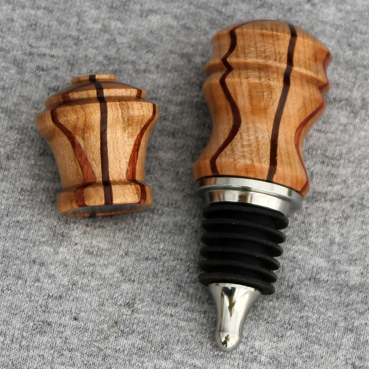 Matching bottlestopper/refrigerator magnet set. Light wood is Maple, and veneer inserts are Ipe (the darkest) and Padauk (the reddish).