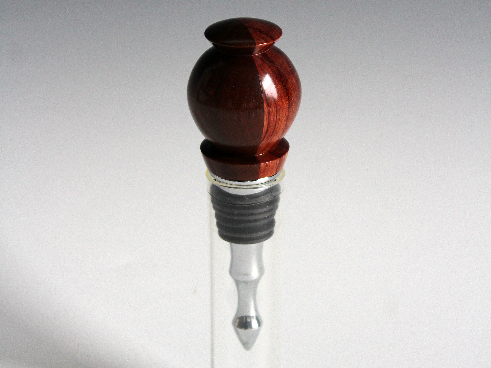 Ipe (ironwood) and Bubinga bottlestopper with stainless steel and silicone stopper.