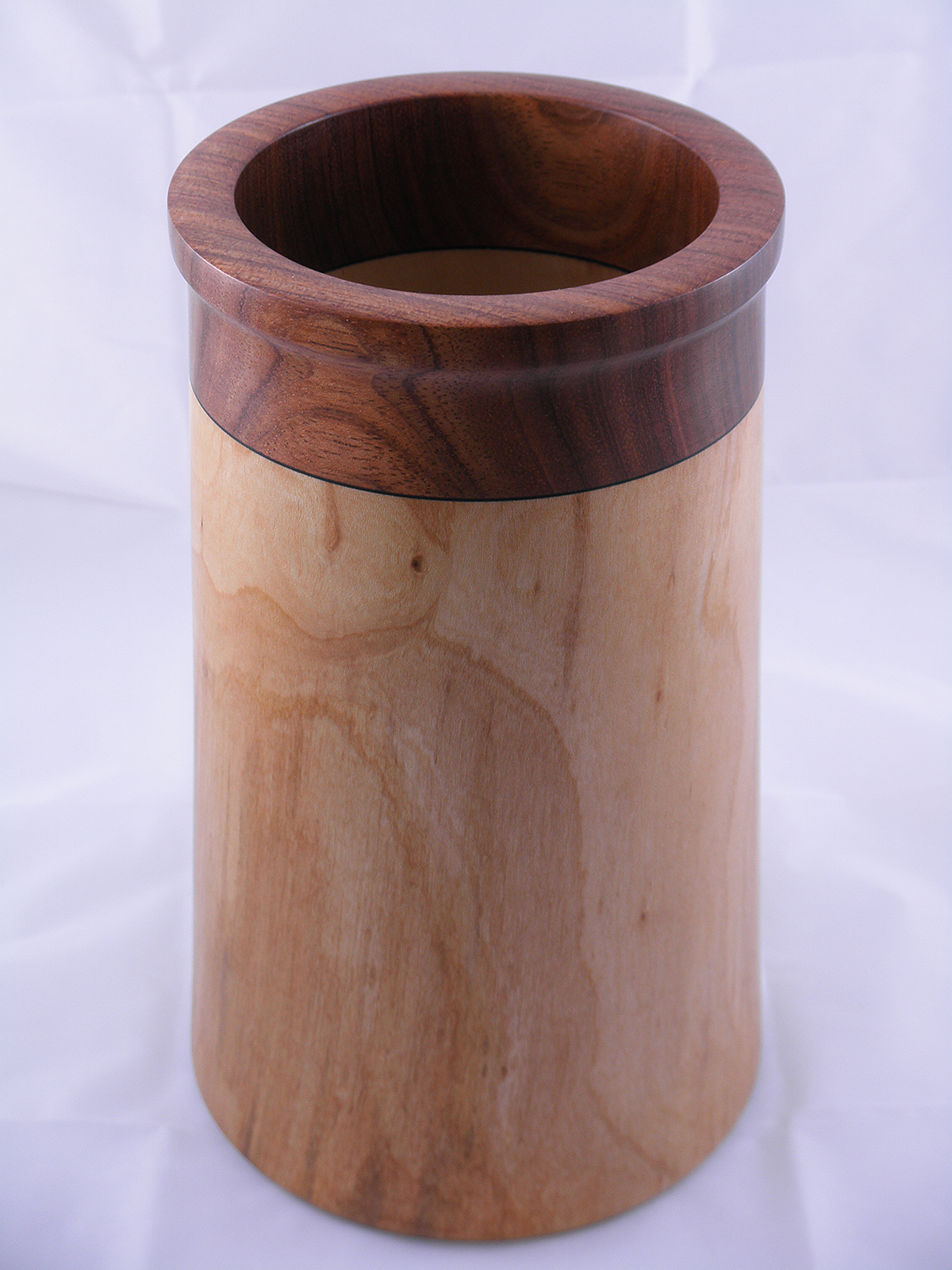 Cherry (bottom part), walnut (thin veneer ring), and mystery wood (top); 4-5/8″ dia. at the rim; 5-1/4″ dia. at the base; 8-5/8″ tall.