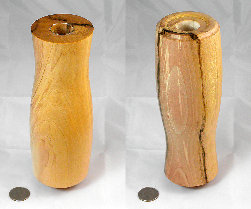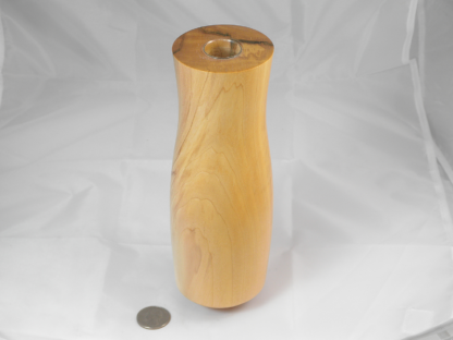 Maple vase (with 1″ x 4″ plastic insert); 2-3/4″ dia. x 7-5/8″ tall.