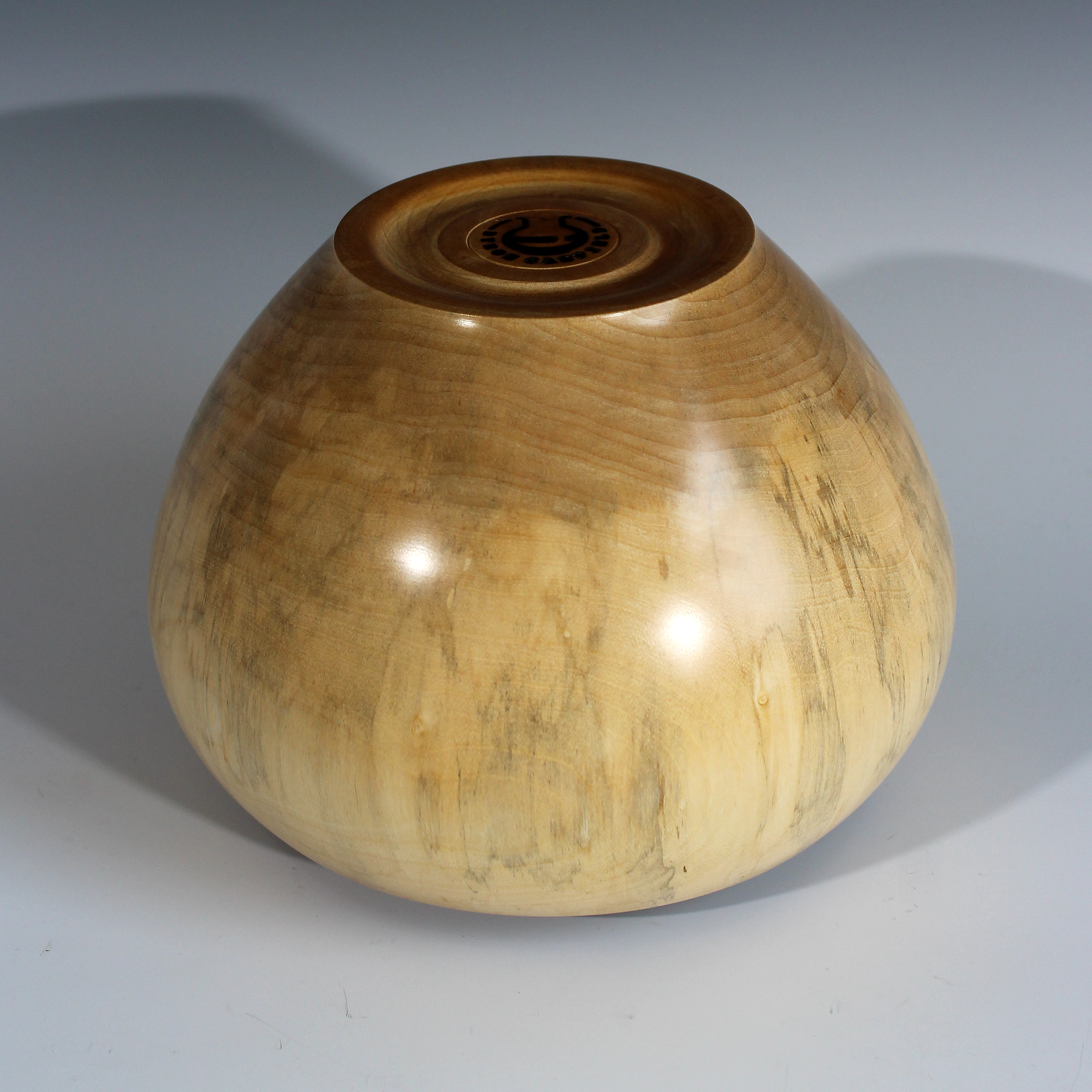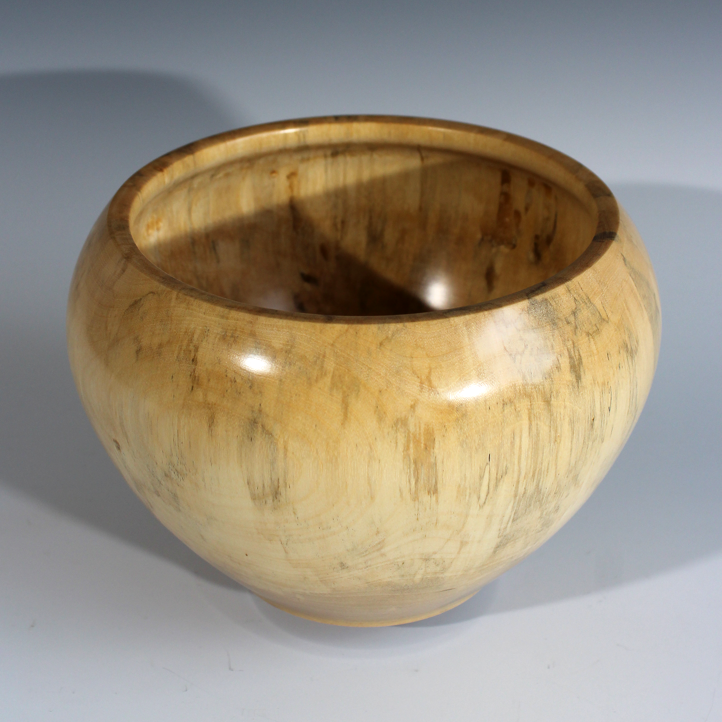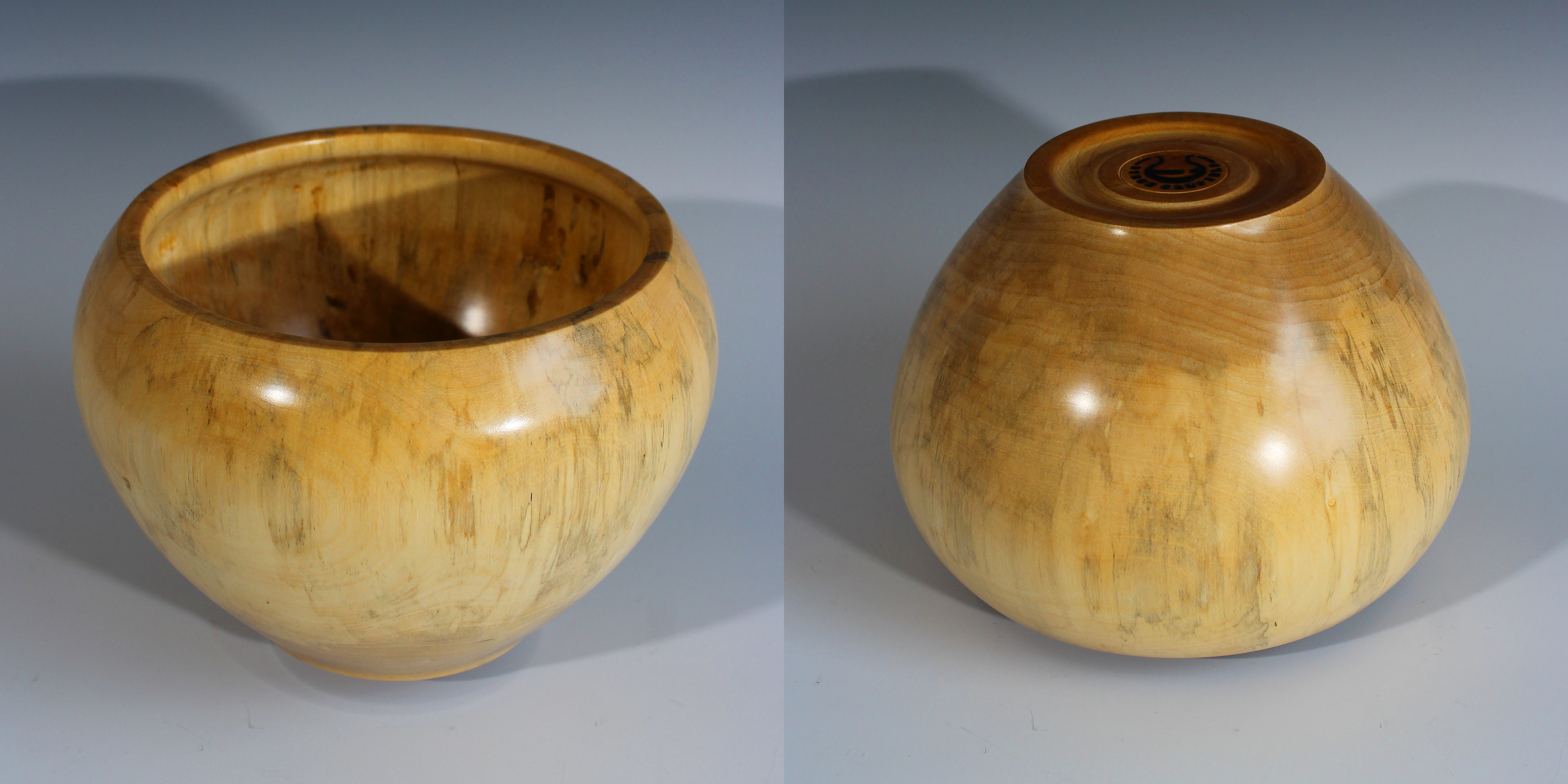 Birch bowl, from tree felled in Lake Forest Park. Gifted to donors of wood. 6-3/4″ dia. x 4-5/8″ tall. Finished with Shellac sanding sealer, EEE Ultrashine, and Carnuba wax. Inside was thoroughly soaked with cyanoacrylate glue (super glue), as it had become quite “punky” while in storage, and was too soft to cut smoothly (until so treated).