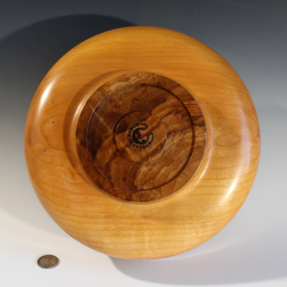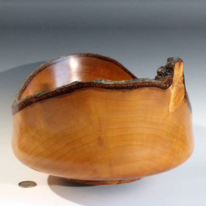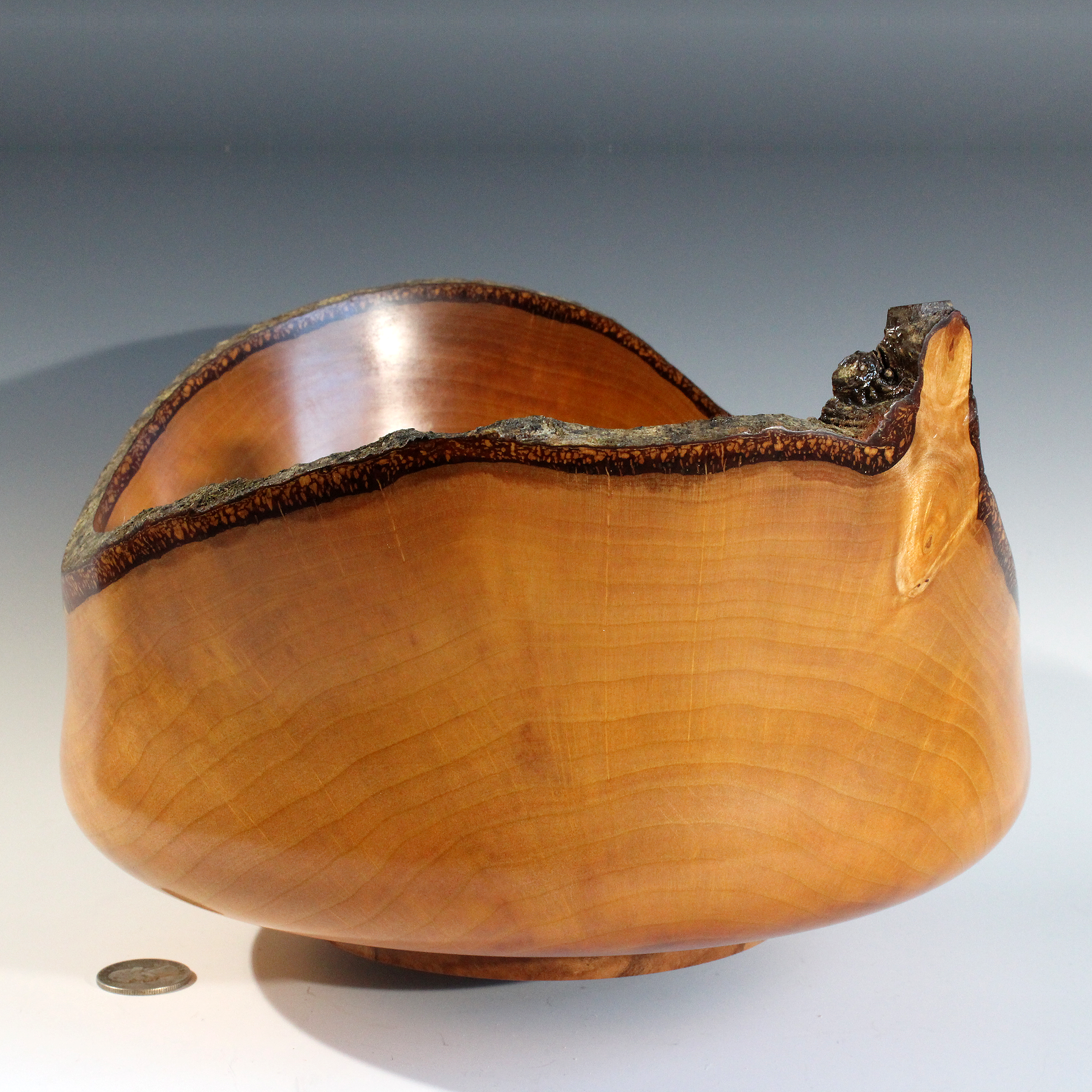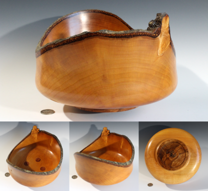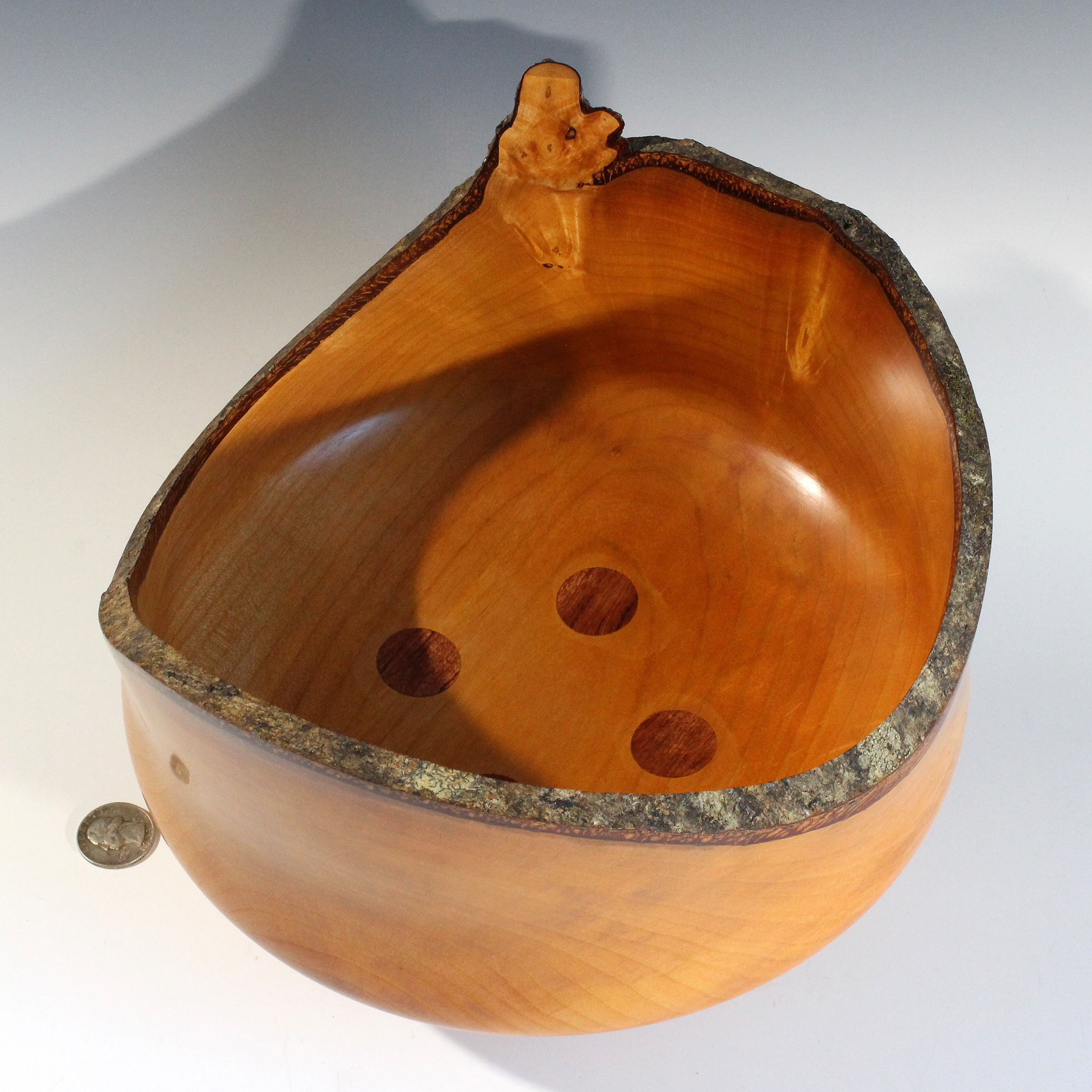 Alder natural edge bowl with Ipe plugs and a Walnut foot; 10-1/2″ dia. x 6-3/8″ tall; finished with Danish oil and Beale buffing system.