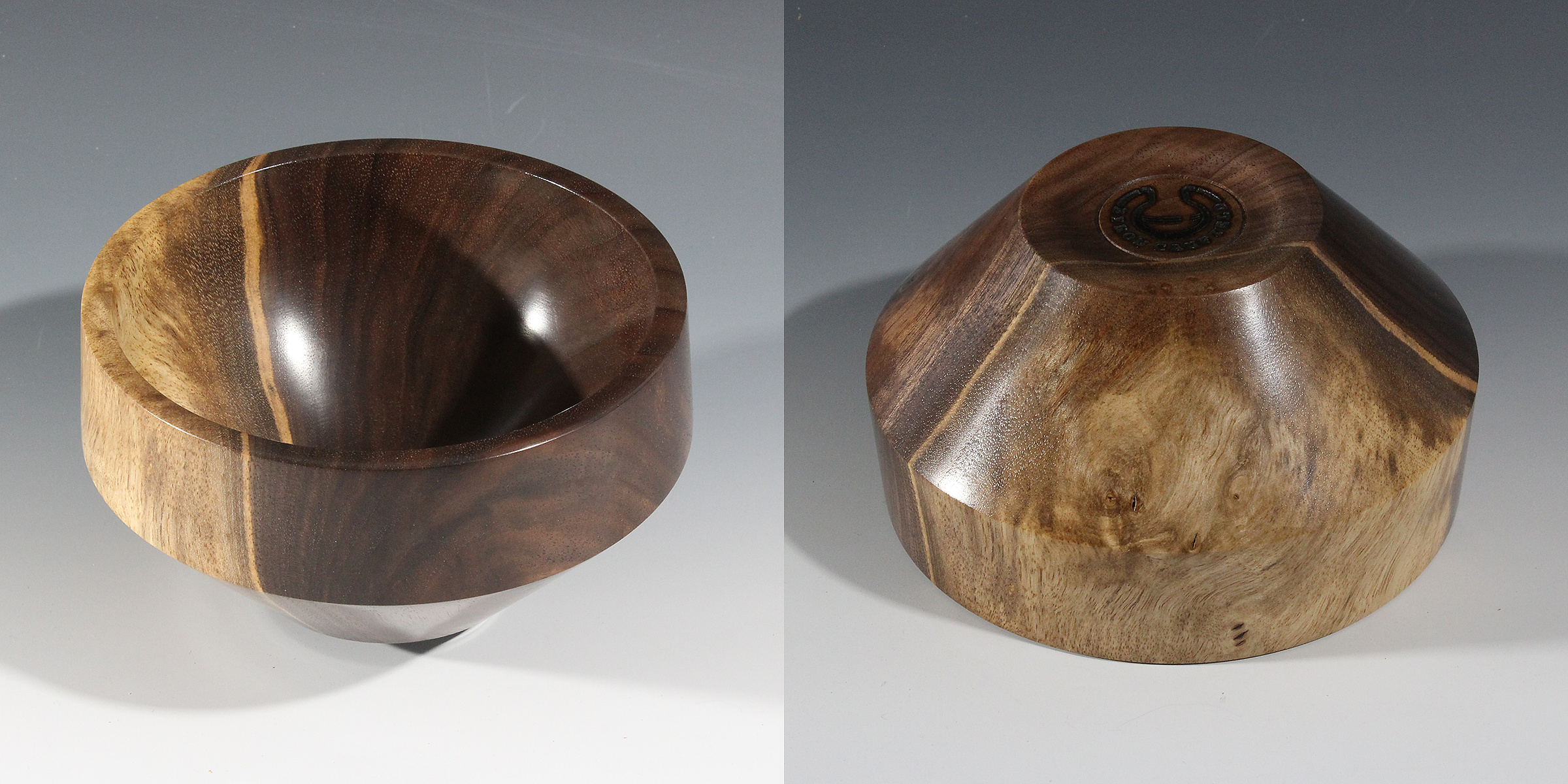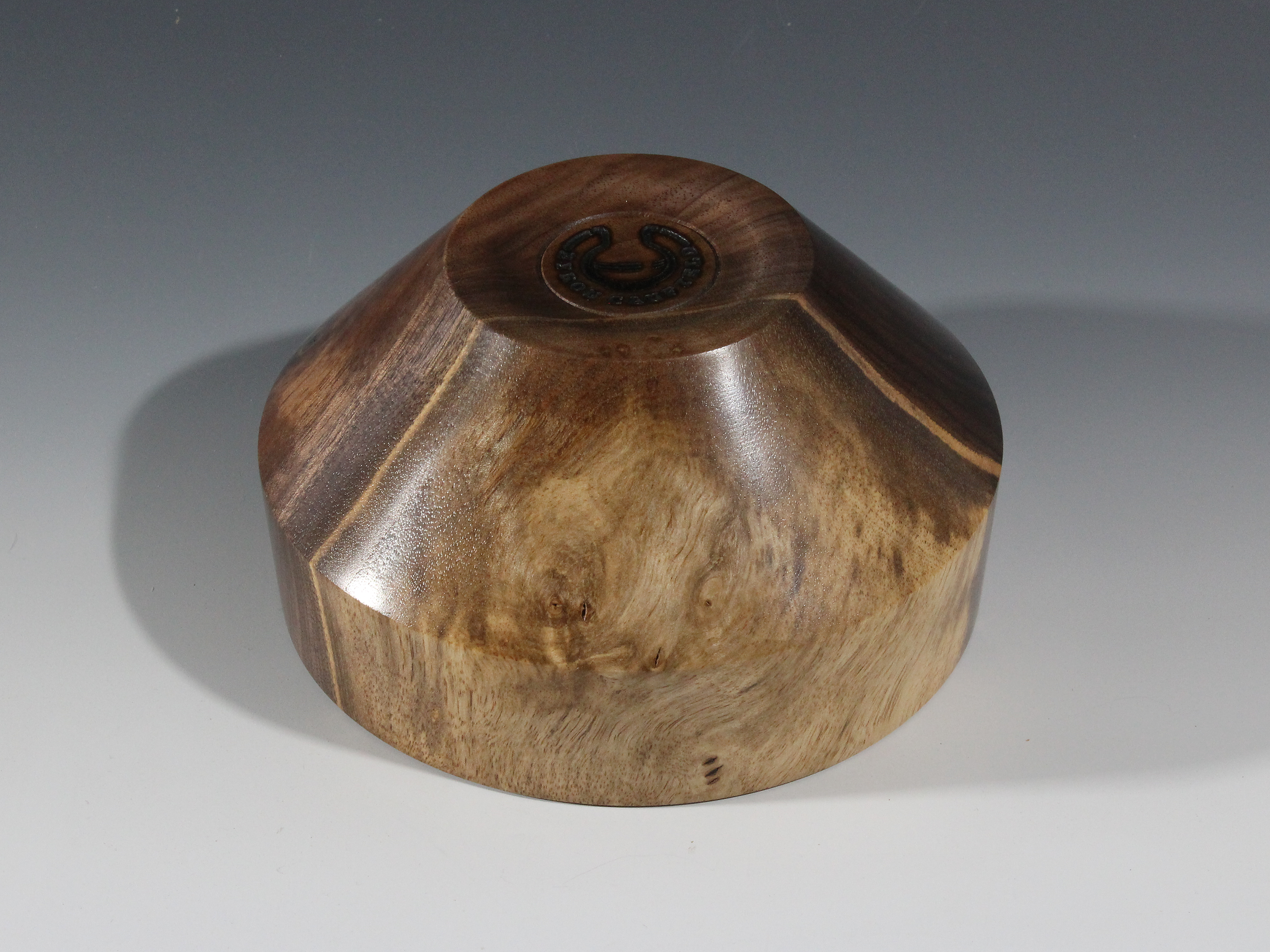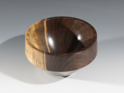 Walnut bowl; finished with Danish oil, buffed with Carnuba wax; 5-1/4″ x 2-15/16″ tall.