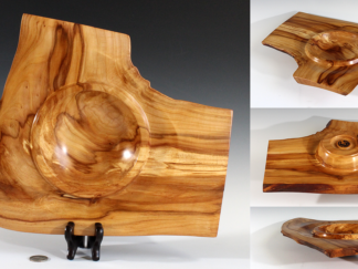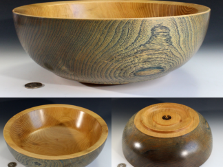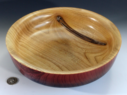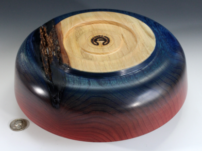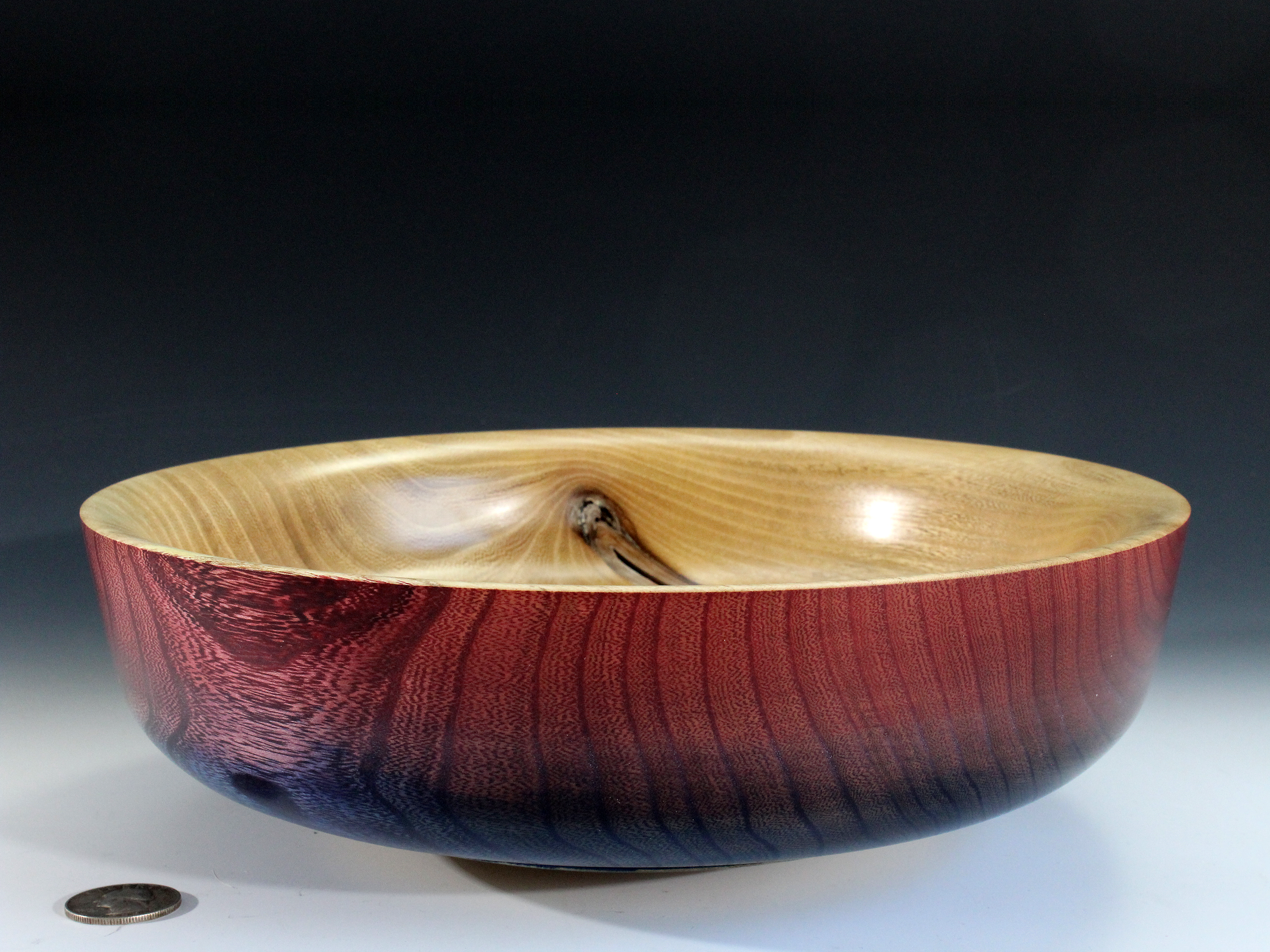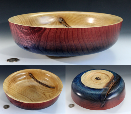 Black Locust Bowl; outside color is aniline dye; Danish Oil finish; 10″ dia. x 2-3/4″ tall