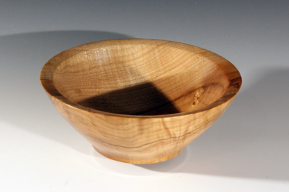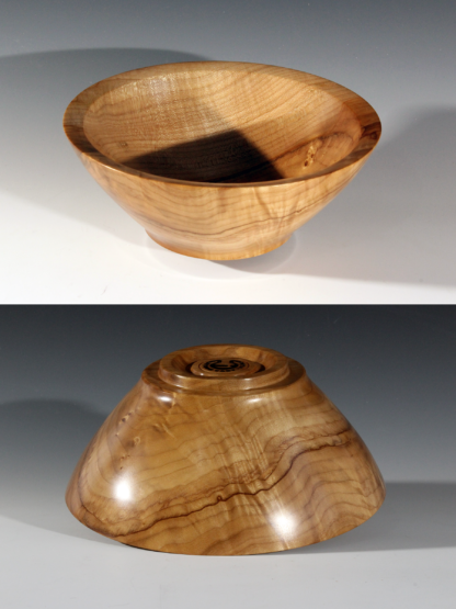 DESCRIPTION: This big leaf maple bowl came from a storm-felled tree that landed across the driveway of JoAnne Kirley, Chehalis, Washington. The name “Kirley Maple” is a bit of an inside joke for wood aficionados, as “curly maple” refers to a rippled grain phenomenon, also quite evident on this piece (along with the spalting), that results from growth stress.