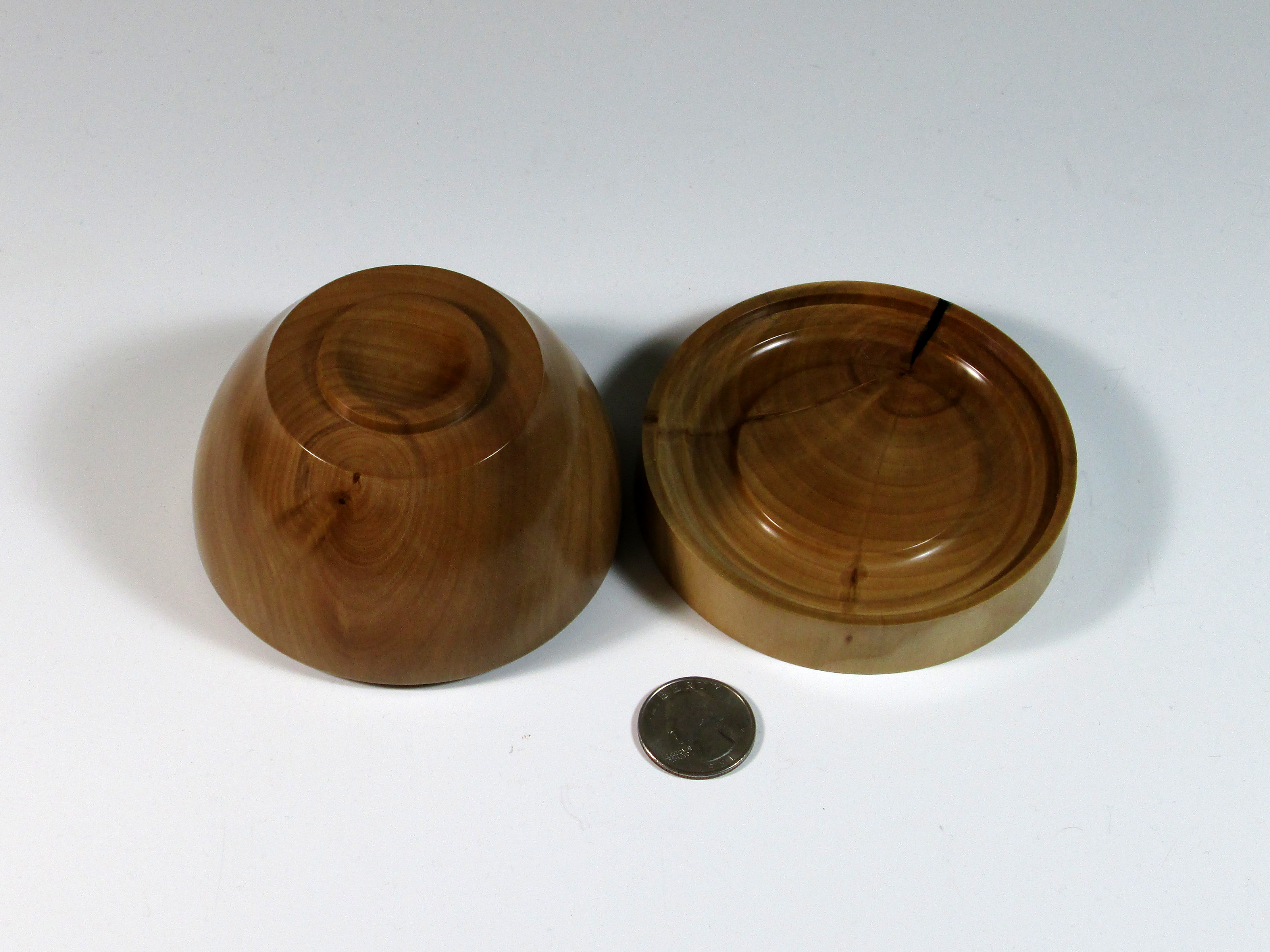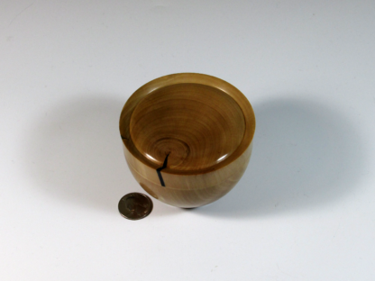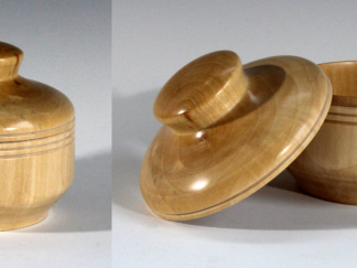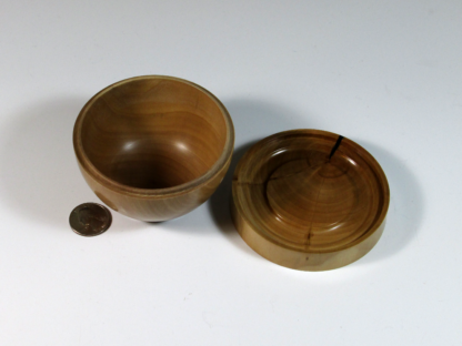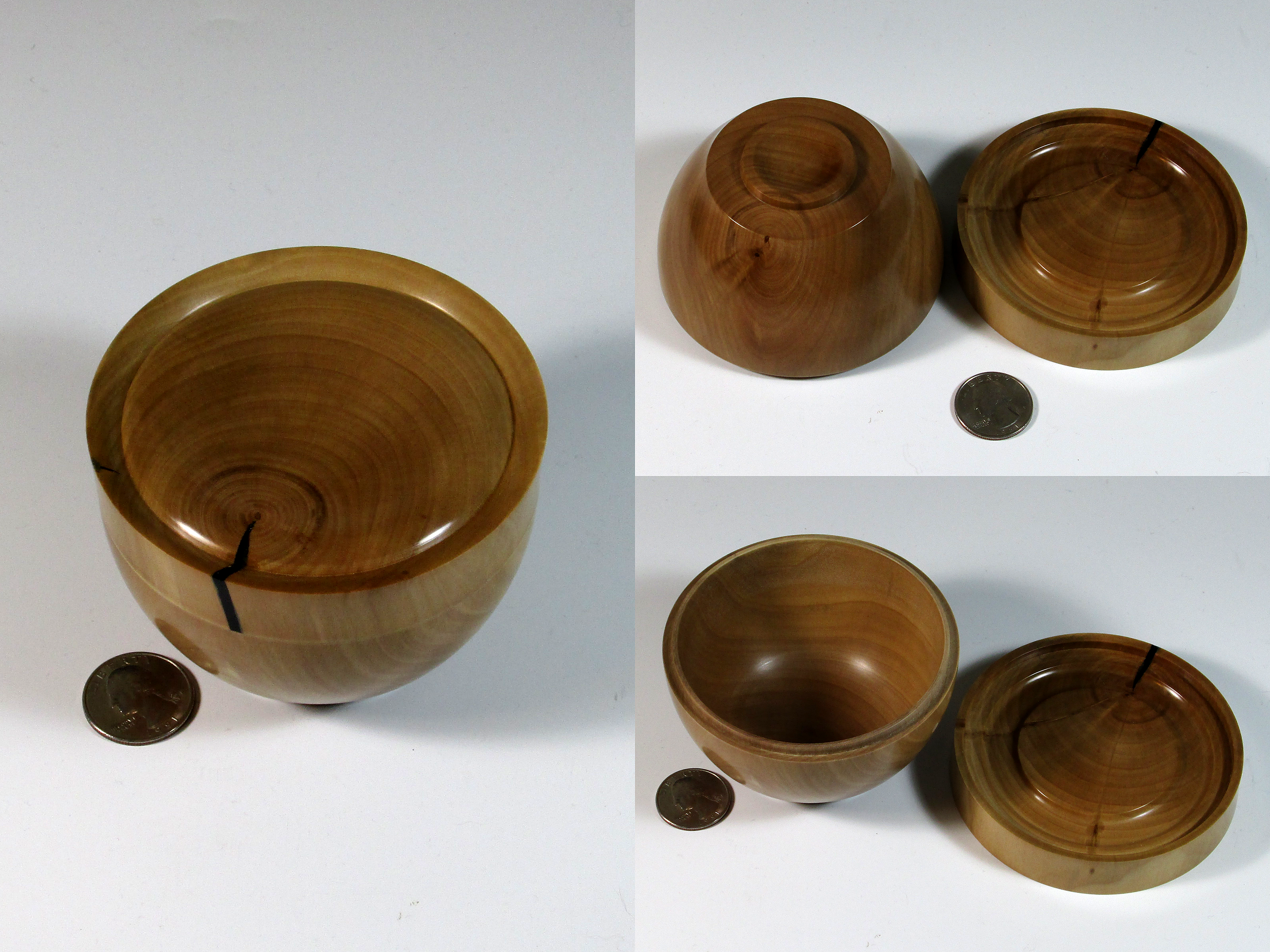 Lidded bowl; had it marked as sycamore, but it looks (and behaved — the crack) more like madrone, to me; 3-11/16″ dia. x 2-5/8″ tall